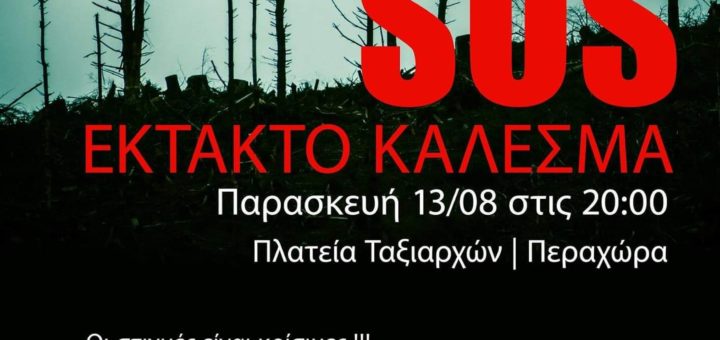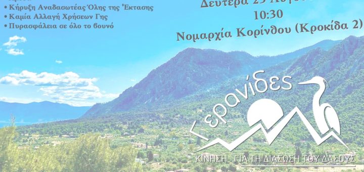 Τη Δευτέρα 23 Αυγούστου, συγκεντρωνόμαστε στη Περιφέρεια Κορινθίας (Κόρινθο) για να ζητήσουμε την άμεση υλοποίηση των απαραίτητων έργων για την περιοχή των Γερανείων που καταστράφηκε από την πυρκαγιά.