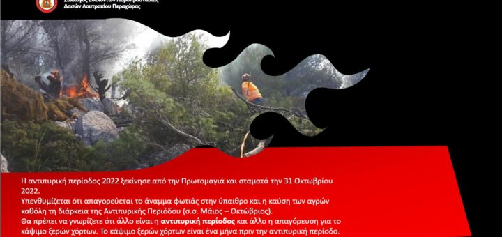 Αντιπυρική περίοδος 2022 Ξεκίνησε από 1η Μαΐου ως & 31 Οκτωβρίου ΠΡΟΕΤΟΙΜΑΣΤΕΙΤΕ Αν βρίσκεστε στην ύπαιθρο Μην καίτε σκουπίδια ή ξερά χόρτα και κλαδιά κατά τους θερινούς μήνες. Μην ανάβετε υπαίθριες ψησταριές στα δάση Διαβάστε Περισσότερα